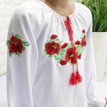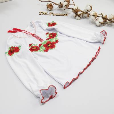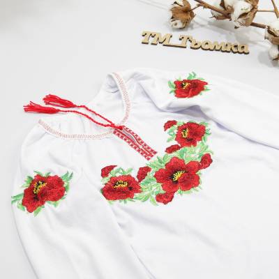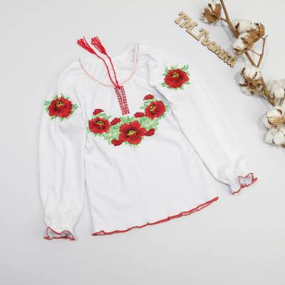 Блуза -вишишиванка n д/р “Маки” n Розміри з 110 до 140 n Тканина: інтерлок n бавовна 95%, єластан 5% n •якісна, натуральна тканина; n •машинна вишивка гладдю; n •зав’язки з китицями; n •рукавчик на плечі з вишивкою, з низу призібраний в рюш; n •поділ вишиванки прямий, однотонний, що дозволяє носити сорочку, як вільно так і заправленною в спідничку чи штани; n •повномірні розміри; n n Розміри n 110,116,122,128,134,140