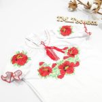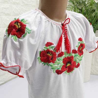 Блуза -вишишиванка n к/р “Маки” n Розміри з 104 до 122 Тканина: кулір/пеньє n бавовна 95%, єластан 5% n •якісна, натуральна тканина; n •машинна вишивка гладдю; n •зав’язки з китицями; n •рукавчик на плечі з вишивкою та призібраний в рюш; n •поділ вишиванки прямий, однотонний, що дозволяє носити сорочку, як вільно так і заправленною в спідничку чи штани; n •повномірні розміри; n n Розміри 104,110,116,122