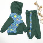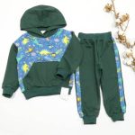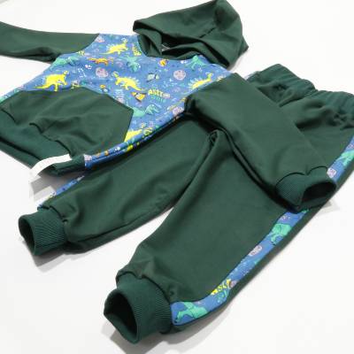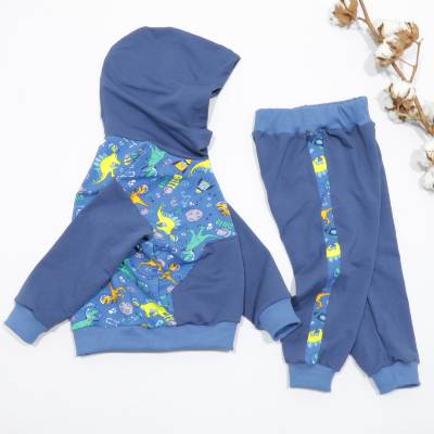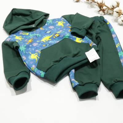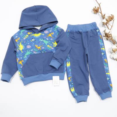 Костюм “Діно” Розміри з 80 до 104 Тканина: 2.нитка/хб •преміальна турецька тканина, ізнанка на бавовняній основі, натуральна приємна до тіла; •батнік в стилі oversize, з карманом “кенгуру” і капюшоном; •штани з лампасами та з помірною, зручною лінією сидіння; •хороша, легка моделька на сезони весна-літо-осінь; •повномірні розміри; Розміри 80,86,92,98,104