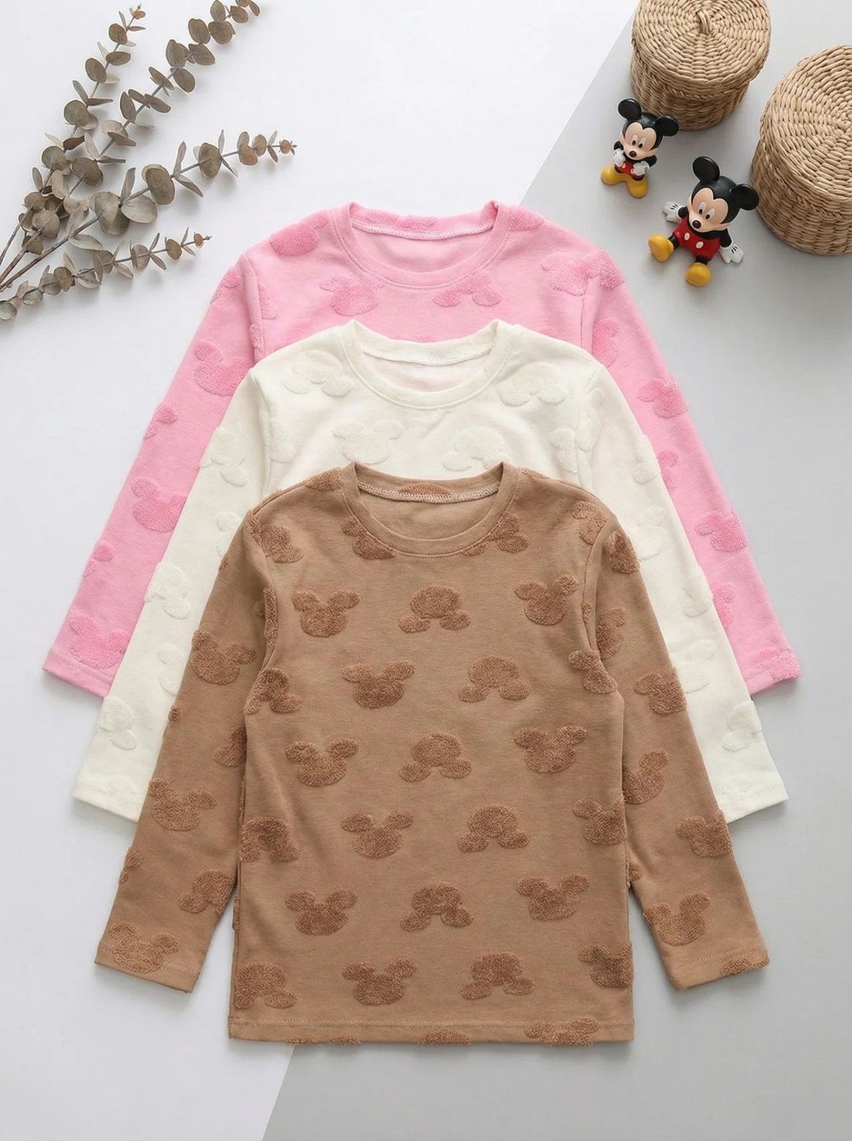 Лонгслів “Міккі” карамель кулір/жаккард -крутезна новинка сезону 2026, кулірна гладь з виступом нитки в плюшевий візерунок, м’яка та приємна, 80%бавовна, 20%поліестр✅ няшний, моднявий, не звичний лонг в плюшеві вушка Міккі 86,92,98,104,110
