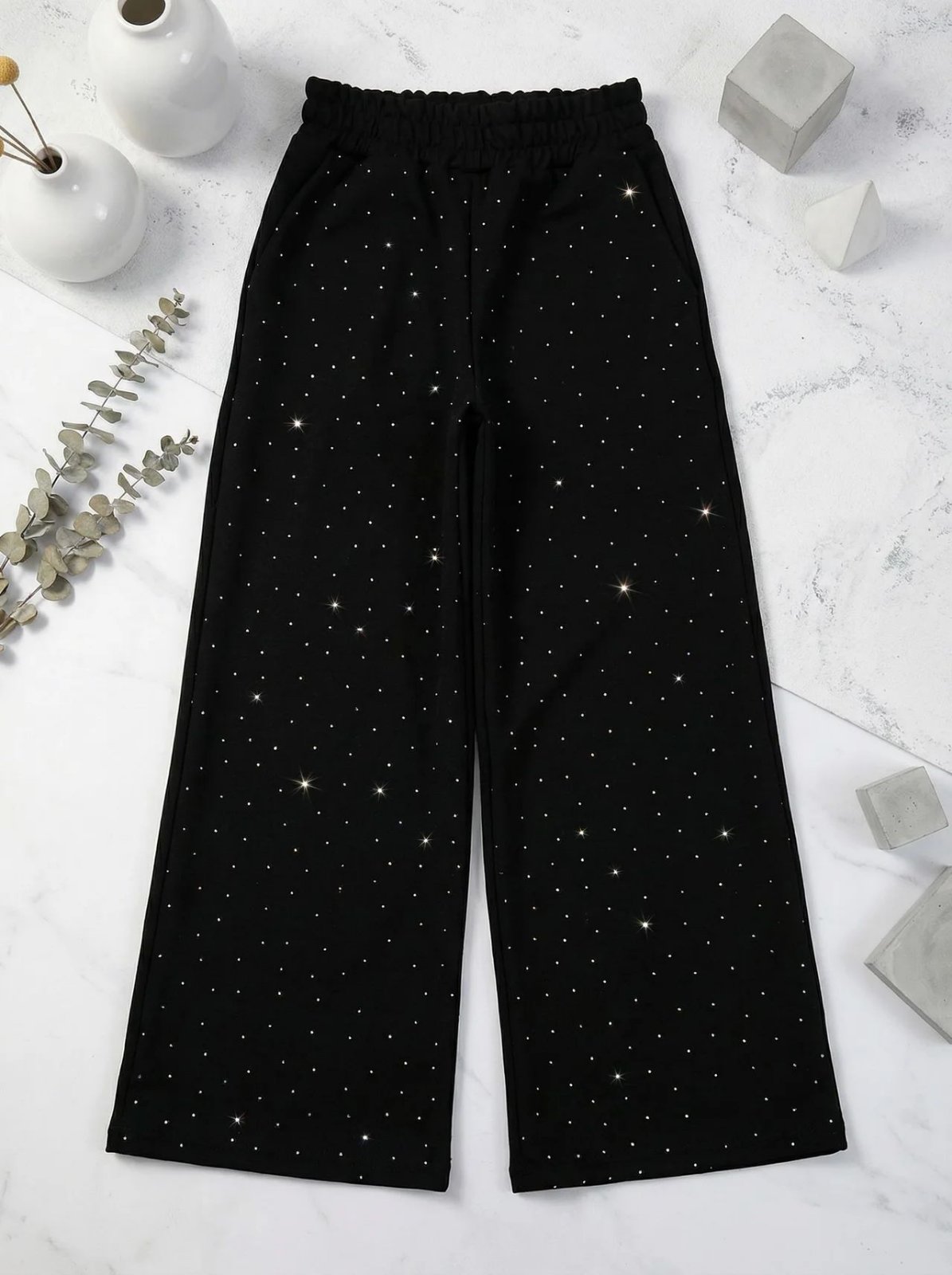 Палаццо “Стрази” чорні🧵 2.нитка/пеньє -люксова, турецька тканина з фабричним нанесенням стразів ✅ стрази -тренд сезону, крутезна моделька, з широким поясом, з карманами, з гарним кльошем від бедра, ідеально стилізуються в костюми з нашими джемперами📏 116,122,128,134