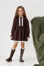 Плаття шоколадний арт.88431 мікровельвет -бавовняна, зносостійка, практична та гарна тканина✅ гарнюще платтячко, по спинці на ґудзику, рукава при зібрані в рюш, зі стильним льняним мереживом 116,122,128,134,140
