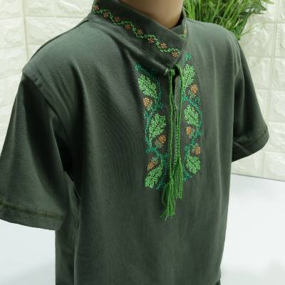 Сорочка -вишиванка n к/р “Дубки” n Розміри з 104 до 122 n Тканина: кулір/пеньє n бавовна 95%, єластан 5% n •якісна, натуральна тканина; n •машинна вишивка хрестиком; n •по горловині стійочка на зав’язках з китицями; n •поділ вишиванки прямий, однотонний, що дозволяє носити сорочку, як вільно так і заправленною в штани; n •повномірні розміри; n n Розміри 104,110,116,122